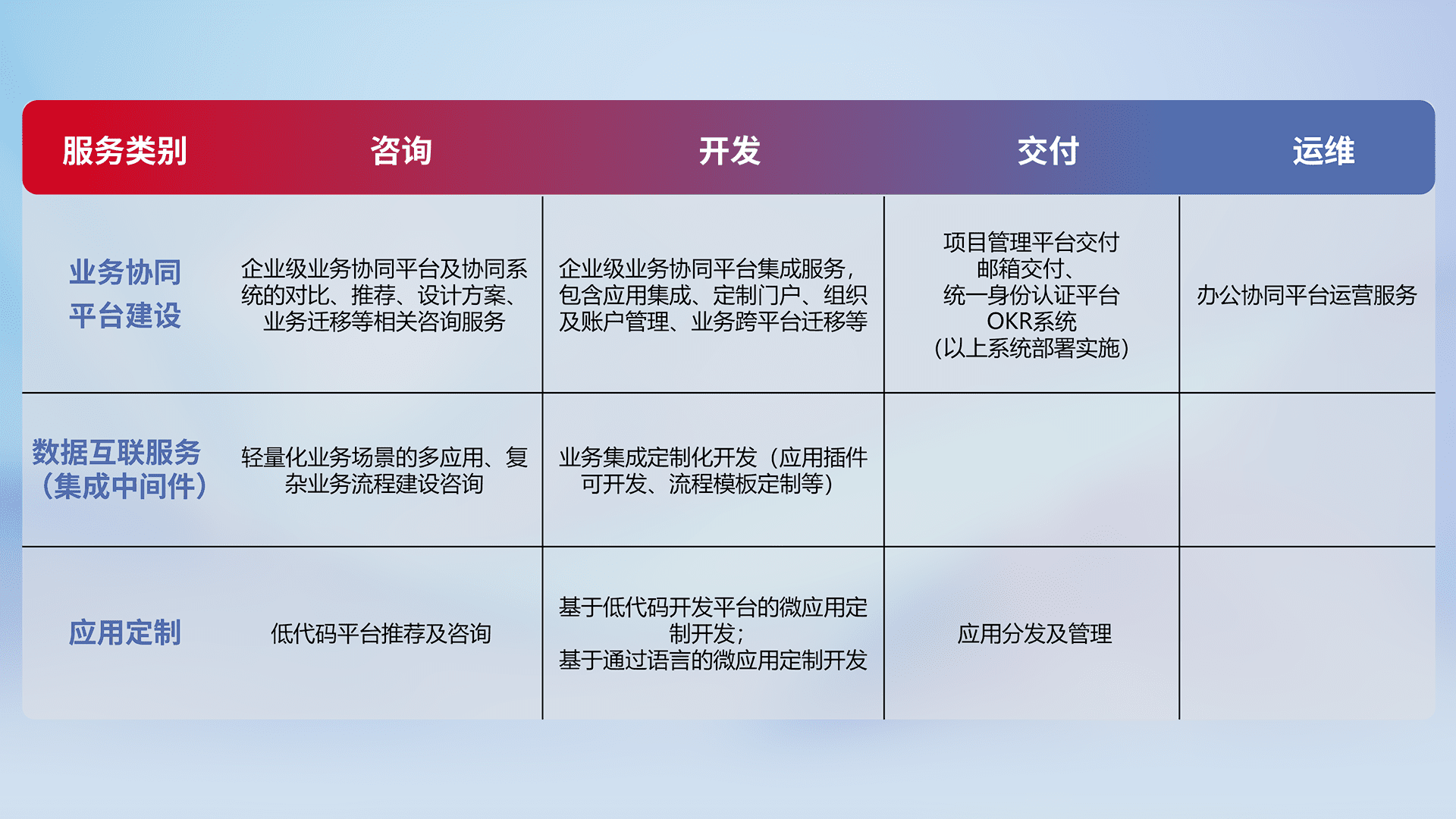 针对钉钉、、、企微、、、、IDaas等平台级产品提供产品的规划、、、方案、、、交付、、定制化开发等服务,,实现如统一协同办公、、智能客户服务、、、、混合会议管理、、、智能数据查询、、等业务场景,,,,实现数字化转型。。。